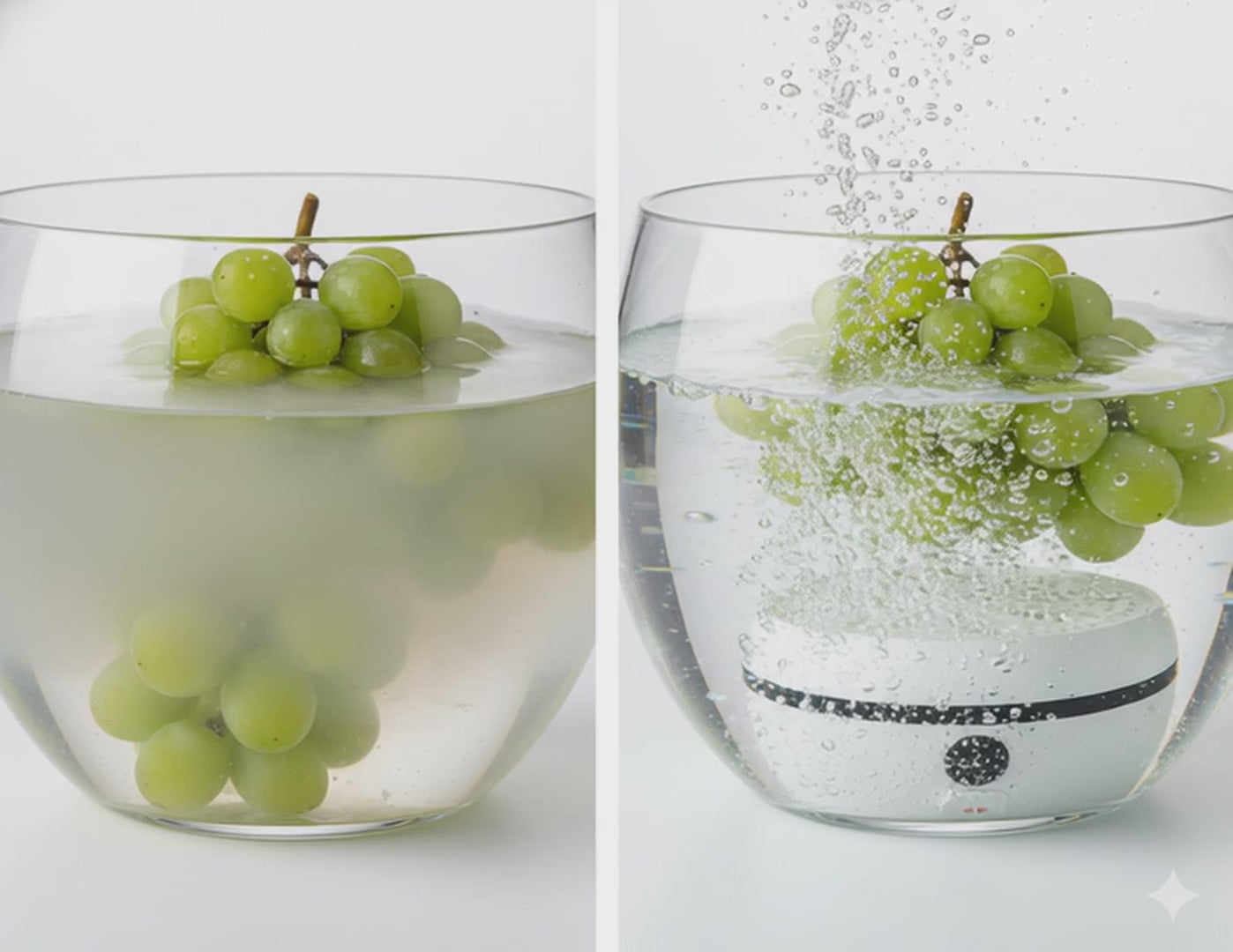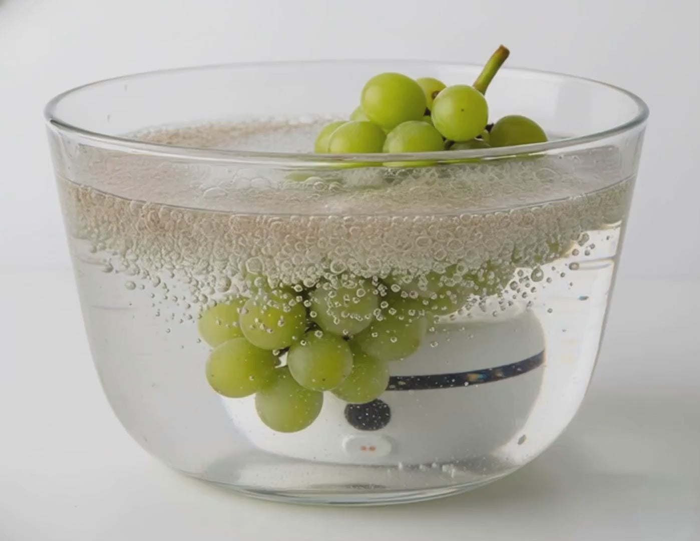 Cihaz çalışırken sudaki yoğun kabarcıklanmayı ve 'aktif oksijen' kokusunu fark edeceksiniz. İşlem bittikten sonra, özellikle pestisit yoğun gıdalarda (çilek, üzüm gibi) suyun yüzeyinde biriken yağımsı tabakayı (çözünen pestisit kalıntısı) görebilirsiniz.