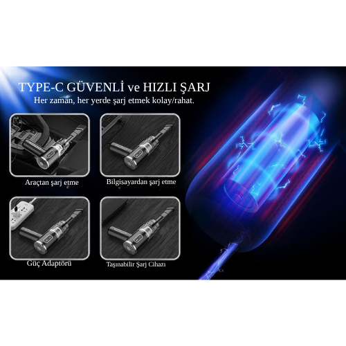 2'si 1 Arada | Yüksek Güçlü Type-C Şarjlı Kablosuz Araç ve Ev El Süpürgesi